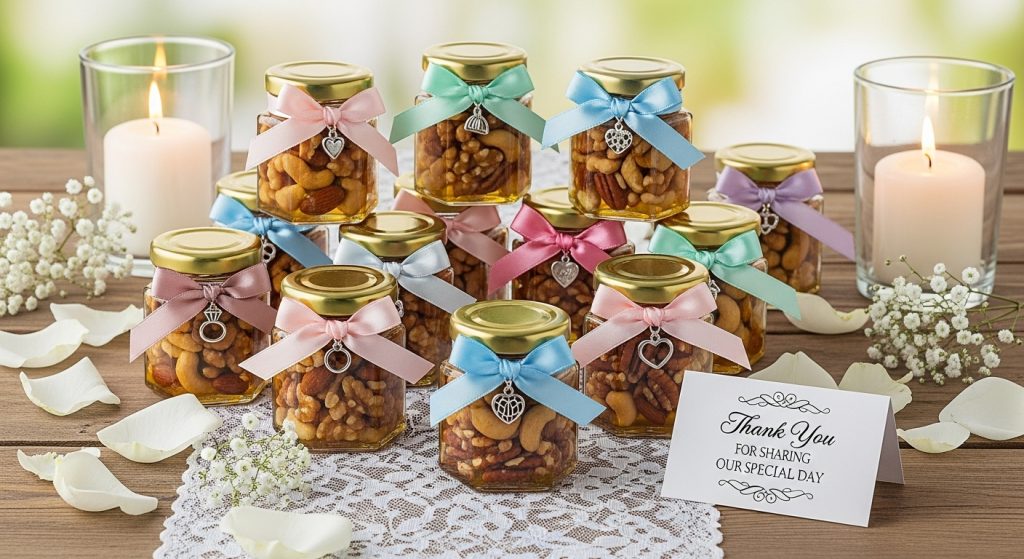 Want to keep things natural and crunchy? Pack some roasted nuts drizzled with honey. Package them in small jars or pouches and tie with your theme colours. They’re healthy, tasty, and proudly local.
